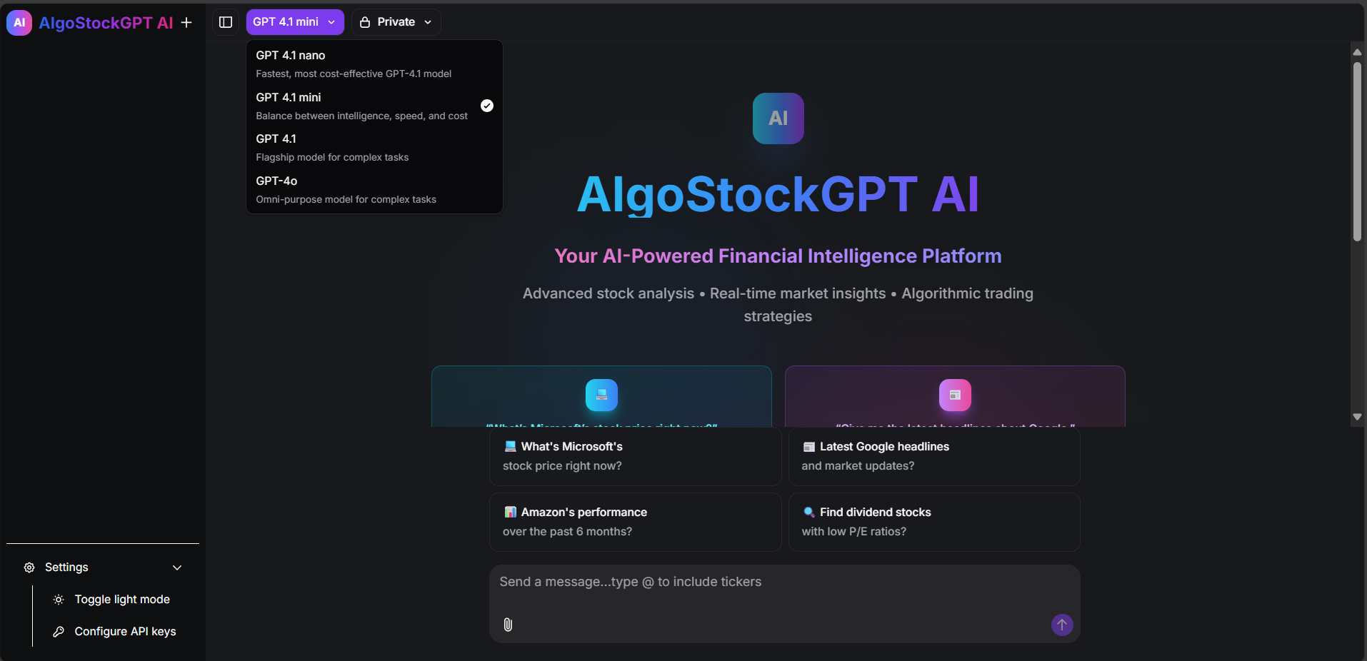 AlgoStockGPT AI is a cutting-edge financial intelligence platform that leverages the power of artificial intelligence to provide comprehensive stock analysis, real-time market insights, and algorithmic trading strategies. Your personal AI financial analyst, providing institutional-grade stock analysis and market intelligence through a seamless, conversational interface.