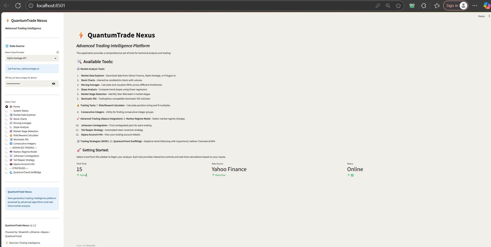 Advanced Trading Intelligence Platform - Comprehensive financial analysis toolkit with 15+ technical indicators, algorithmic strategies, and real-time market intelligence. Features include market scanner, custom signals, advanced trading tools, and trading strategies with backtesting capabilities. Supports multiple data sources including Yahoo Finance and online APIs.